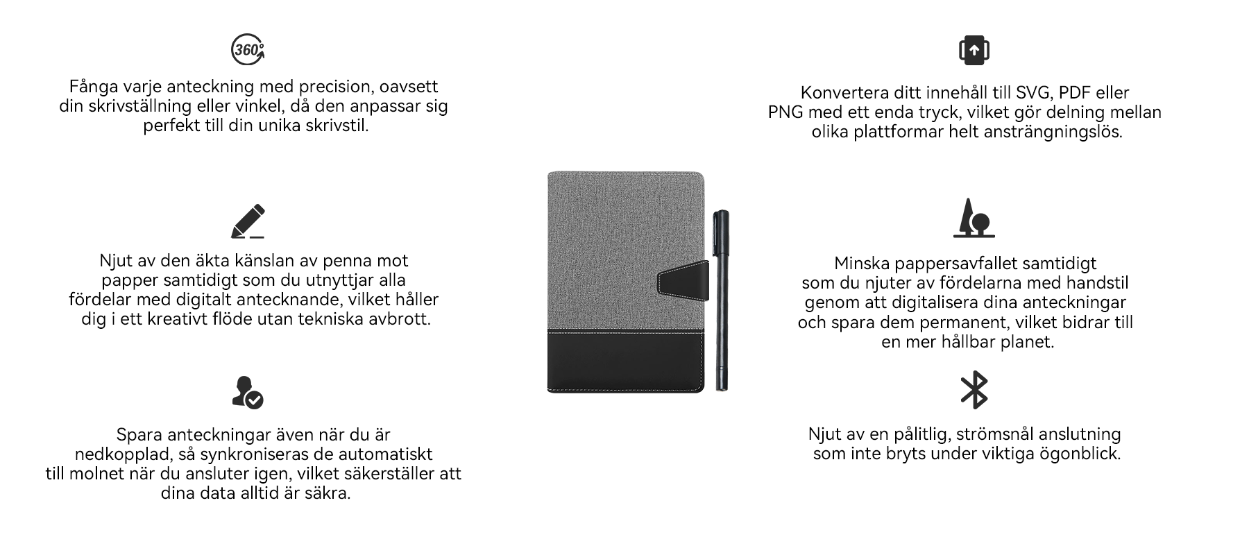 Oavsett om du är på ett flygplan, i tunnelbanan eller saknar täckning kan varje tanke fångas med lätthet. Bluetooth-lagring offline sparar säkert upp till 50 sidor och synkroniseras automatiskt när du är online igen – så att din inspiration alltid är i tryggt förvar.