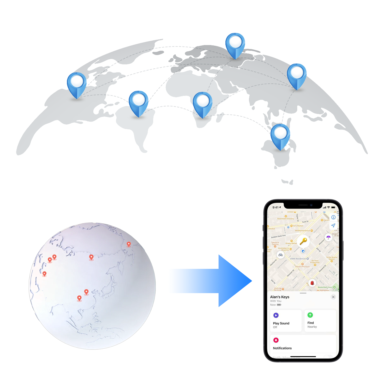 - Global spårning: Lokalisera dina ägodelar var som helst i världen med en precision på ner till en meter.