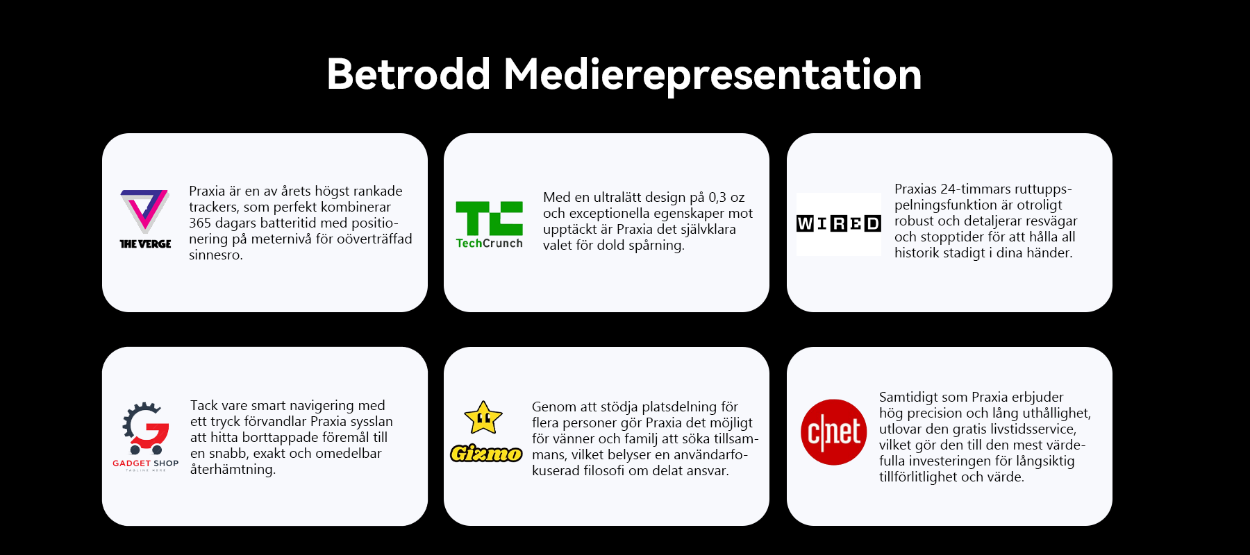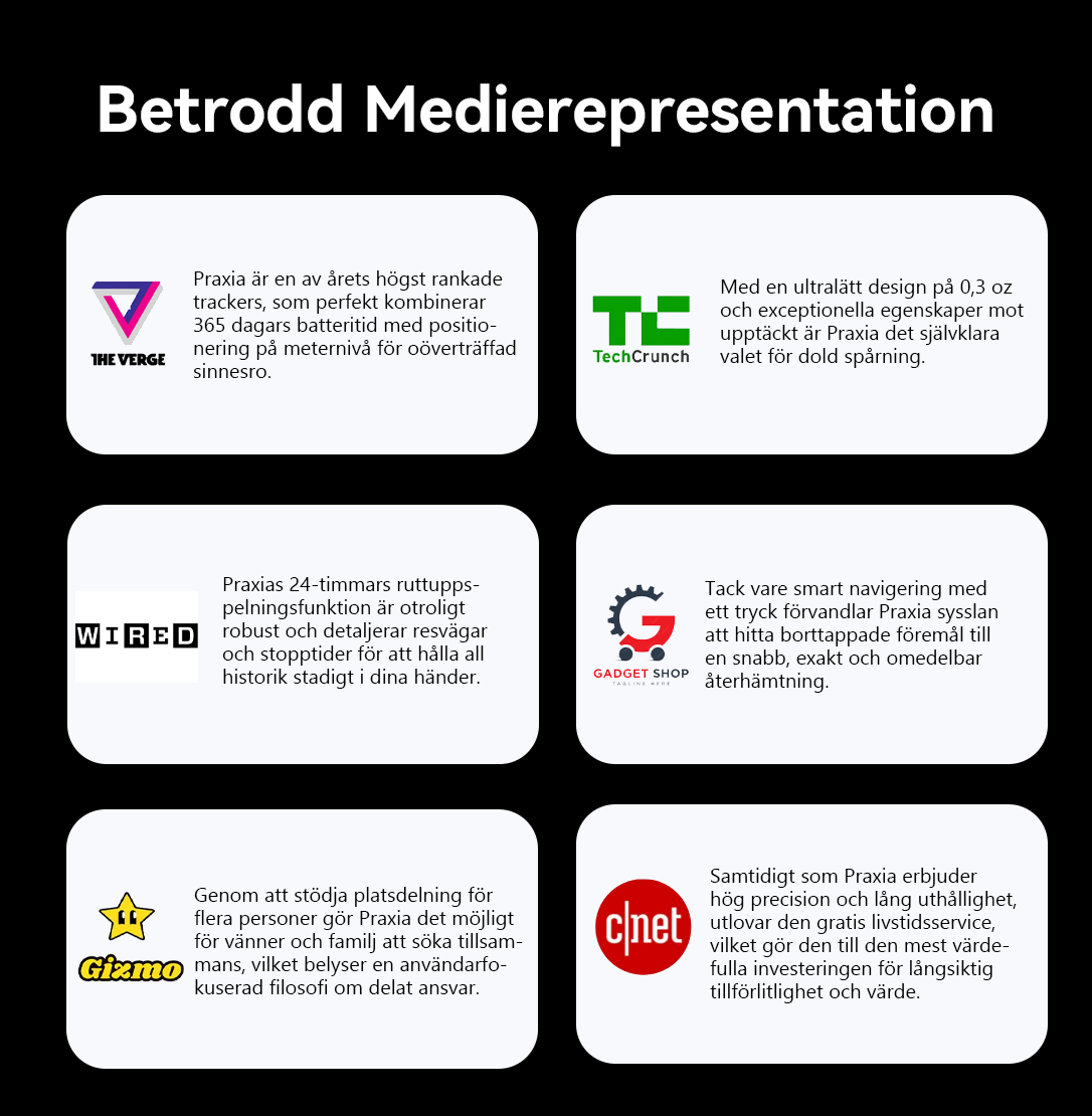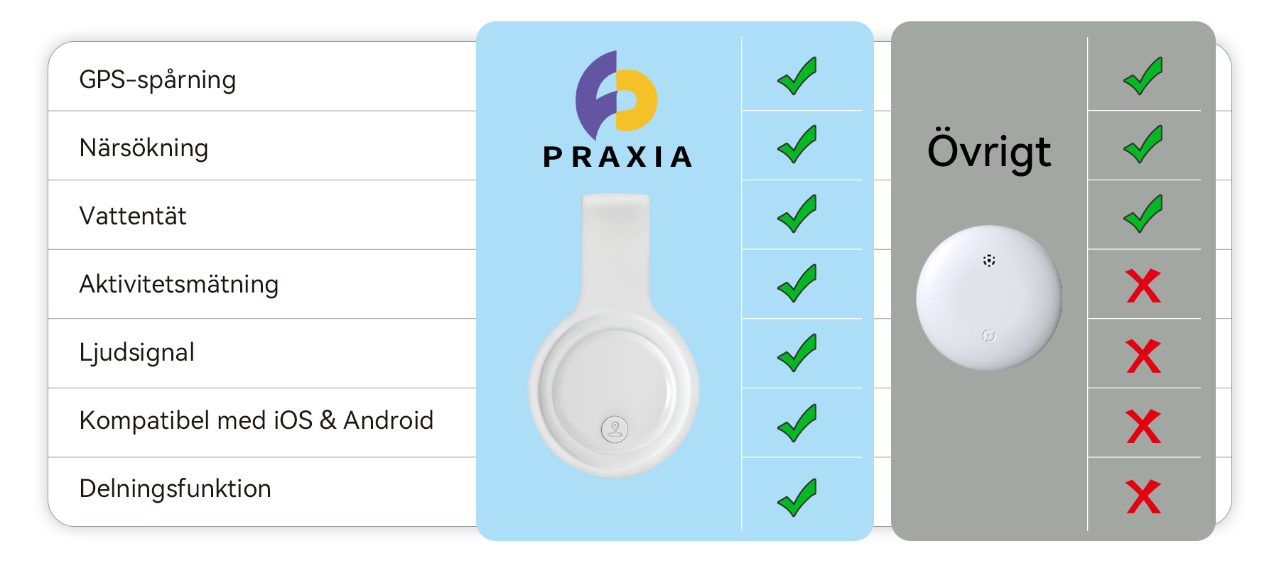 Slik föddes Praxia. Denna kompakta och lätta enhet kan enkelt fästas på en ryggsäck, glida ner i en ficka eller placeras i en resväska, vilket gör säkerhet helt ansträngningslöst. Praxia ger ett enkelt löfte: att hålla dig ständigt uppkopplad mot din familj och dina värdesaker, så att du kan släppa oron och få sinnesro.