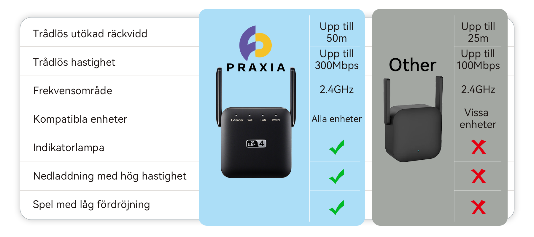 Resultatet är Praxia WiFi-förstärkare. Det enda målet med denna förstärkare är att utöka ditt hems räckvidd och eliminera döda zoner. Den har dubbla antenner med hög genomträngningsförmåga och en plug-and-play-design som säkerställer ett snabbt nätverk i varje rum. Detta är Praxias kärnlöfte: att få ditt nätverk att nå varje hörn av ditt hem.